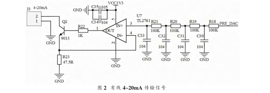 有線傳輸模塊信號為4~20mA的電流信號。如圖2所 示,CPU將采集到的壓力值轉(zhuǎn)化為電壓信號,電壓信號進(jìn) 行4級濾波處理,到達(dá)運(yùn)算放大器的輸入端。運(yùn)算放大器 輸出端控制NPN三極管輸出電流信號。電流值為運(yùn)算放 大器U7同相輸入端(3卿電壓與R23的比值。