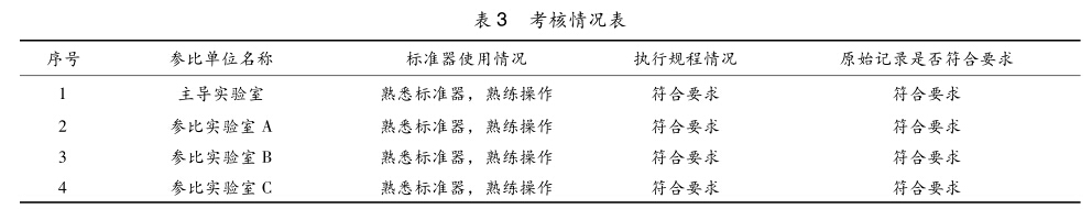 現(xiàn)場(chǎng)由比對(duì)專家組對(duì)參比實(shí)驗(yàn)室的技術(shù)人員 進(jìn)行現(xiàn)場(chǎng)考核,主要是從標(biāo)準(zhǔn)器的使用情況、執(zhí) 行規(guī)程情況、原始記錄是否正確完整等3個(gè)方面 進(jìn)行考核??己饲闆r如表3所示。