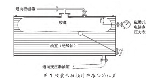 當膠囊破損時,空氣通過膠囊進入到儲油柜油 室,油室與膠囊內部(大氣壓)氣壓逐漸平衡,油室內 的絕緣油流動到膠囊下方;由于絕緣油油位的下降, 從而使壓力表處的油壓降低。此時,壓力表內的布爾 登彈簧旋轉,進而觸發開關觸點,由此發出報警信 號,如圖2所示。