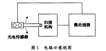 光電傳感器可采用反射式紅外光電傳感器,通過 合理配置其外圍偏置電路使得光電傳感器置于壓力表 指針上方時,有較為顯著地輸出變化。微處理器控制 掃描機構按一定的步距角進行掃描,光電傳感器在搖 桿的帶動下沿指針運行軌跡運動,微處理器通過AD 轉換讀取光電傳感器輸出值,其電路示意框圖如圖1 所示。