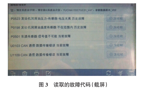 連接故障檢測儀,讀取發動機電控系統的故障代 碼,故障代碼有P0523、P0198、P0501、U0103、U1109 (圖 3),除P0501故障代碼外,其佘4個故障代碼均無法清除。根 據故障代碼P0523的提示,懷疑發動機電控單元到ZC205 間機油壓力信號輸出電路斷路,引起機油壓力信號電壓太 高。由于手頭缺少完整的電線束連接圖,分析圖1的電器工 作原理圖,認為ZC205端子J1-10上的6903線、J4-21上的 1311線分別是和發動機電控單元、空調繼電器連接的,應當 從這2條線入手。
