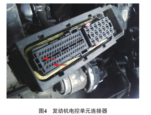 由于整車線束有發動機段線束、底盤段線束、儀表 段線束等,各段線束都是通過連接器進行連接的,查找 時通常查各段線束間連接處是否連接可靠,查找起來很 麻煩,收效甚微。依照維修經驗認為,發動機電控單元和 ZC205連接后進行數據傳輸,中間有儀表、底盤、發動機 段線束連接后,如果連接線路上電阻過大,勢必造成數據 傳輸失效,測量ZC205上的6903、1311線和搭鐵間電阻,約 5.5 kQ,電阻過大,有存在傳輸線路斷路的可能。拔下發動 機電控單元連接器,找1段跨接線,一端分別連接ZC205上 的6903、1311線,另一端連接萬用表1表筆,萬用表另1表筆 上套上較細筆尖的探針,使探針能夠在如圖4所示的發動機 電控單元導線連接器端子上測量。測得圖4上的2個端子分 別和ZC205上的6903、1311線導通,也就是說,ZC205和發 動機電控單元導線連接器上的數據傳輸線6903、 1311是導 通的。懷疑發動機電控單元導線連接器與相關導線之間存 在虛接現象。仔細觀察發動機電控單元導線連接器,發現有 3個端子傾斜,給予校正后,連接好發動機電控單元導線連 接器,并測量6903、1311線與搭鐵間電阻,約為1.2 kQ,起 動發動機,儀表顯示一切正常,空調系統也工作正常了。連 接故障檢測儀,清除故障代碼后重新進入系統讀故障代 碼,只有清不掉的故障代碼U1109。向玉柴機器售后技術人 員請教,說此故障無關緊要,不影響發動機的正常工作,是 發動機電控單元里設置問題,不要管它。