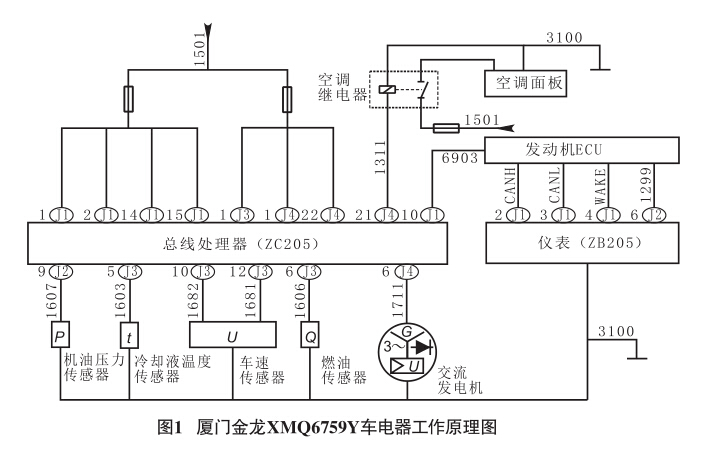 故障現象一輛2012年10月生產的XMQ6759Y廈門金龍客車,裝用玉柴YC4E160-30柴油發動機,累計行駛里程 約為40萬km,因發動機氣缸體有裂紋,漏機油嚴重,無法修 復,更換了發動機氣缸體,試車發現發動機起動順利,工作 平穩,但儀表盤上機油壓力警告燈異常點亮,機油壓力表不 工作,發動機轉速表不動,空調面板上無電源顯示,電器控 制盒上的空調繼電器不工作。