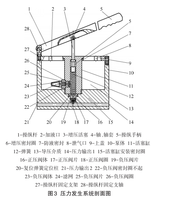 該技術(shù)在于把復(fù)雜的、分散的壓力發(fā)生系統(tǒng)進(jìn)行 科學(xué)的、適用的集成,特別是在單向閥體、閥片方面進(jìn) 行創(chuàng)新,一個鏡面的不易結(jié)垢的金屬薄片材料,用線切 割的方法,加丁成同心圓形的,四面帶有對稱弧面缺口 的閥片,該閥片在單向閥腔內(nèi)由4個突出于弧面的棱角 定位,其鏡面與密封圈緊密配合,當(dāng)閥片兩側(cè)形成壓力 差時,該閥片在單向閥腔內(nèi)的定位空間內(nèi)沿閥片中心 點(diǎn)軸心直線動作,實(shí)現(xiàn)開關(guān),導(dǎo)壓介質(zhì)通過閥片弧面缺 口單方向輸出發(fā)生壓力。單向閥分別正反向安裝于活 塞腔的側(cè)面和底部,導(dǎo)壓介質(zhì)儲液倉設(shè)計(jì)于泵體與增 壓缸體間,增壓活塞有平面和側(cè)面兩道密封安裝與泵體底部,設(shè)計(jì)有注液口、泄氣塞、操縱桿固定軸的上蓋 由密封圈、定位槽限制,用內(nèi)六角螺栓安裝于泵體上, 操縱桿與增壓活塞的作用點(diǎn)設(shè)計(jì)有滾動軸套用滾動軸 裝配于操縱桿上。見圖3壓力發(fā)生系統(tǒng)剖面圖。安裝 于泵體底座的增壓缸體11,緊密配合于增壓缸體11內(nèi) 的增壓活塞3,操縱桿1在操縱手柄5的作用下,安裝與 操縱桿1的軸套4,帶動增壓活塞3,以增壓缸體軸心為 直線向下運(yùn)動,增壓缸體11內(nèi)的導(dǎo)壓介質(zhì)13推開正壓 閥體16內(nèi)的正壓閥片17輸出,操縱桿1在操縱手柄5 外力釋放時,增壓活塞3在復(fù)位彈簧12的作用下返回 上始點(diǎn),增壓缸體11內(nèi)形成負(fù)壓,導(dǎo)壓介質(zhì)13推開負(fù) 壓閥體23內(nèi)的負(fù)壓閥片25輸人增壓缸體11,如此循環(huán) 作用,設(shè)計(jì)于泵體10內(nèi)儲液倉的導(dǎo)壓介質(zhì)13連續(xù)通過 輸出I 14和輸出H21排出,實(shí)現(xiàn)造壓。