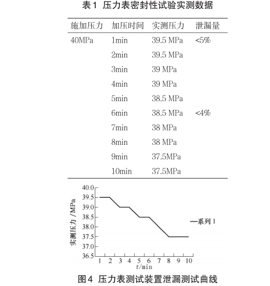 檢定規(guī)程中對壓力表校驗(yàn)器的規(guī)定,加壓5min后 開始計(jì)時,5min的泄漏量不得超過滿量程的4%。壓力 表密封性試驗(yàn)實(shí)測數(shù)據(jù)見表1,壓力表測試裝置泄漏測 試曲線見圖4。