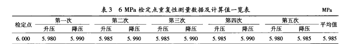 1)利用實驗標準偏差評定方法 為分析測量重復性引人的不確定度分量,需要對 表2中的測量數據進行分析,選取測量數據變化較大 的6 MPa點位觀測點,進行5次重復測量,每次均包 含升壓和降壓過程,共記錄10個測量值進行分析,重 復測量數據如表3所列。