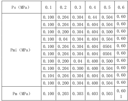 Ps——6組測量點(diǎn)壓強(qiáng)標(biāo)準(zhǔn)值’讀取自數(shù)字壓力校驗(yàn)儀 Pmi——每個(gè)測量點(diǎn)單次測量的示值’讀取自被檢表 Pm——每個(gè)測量點(diǎn)10次測量的示值算術(shù)平均值’根據(jù) 檢定規(guī)程修約到最小分度值1/5