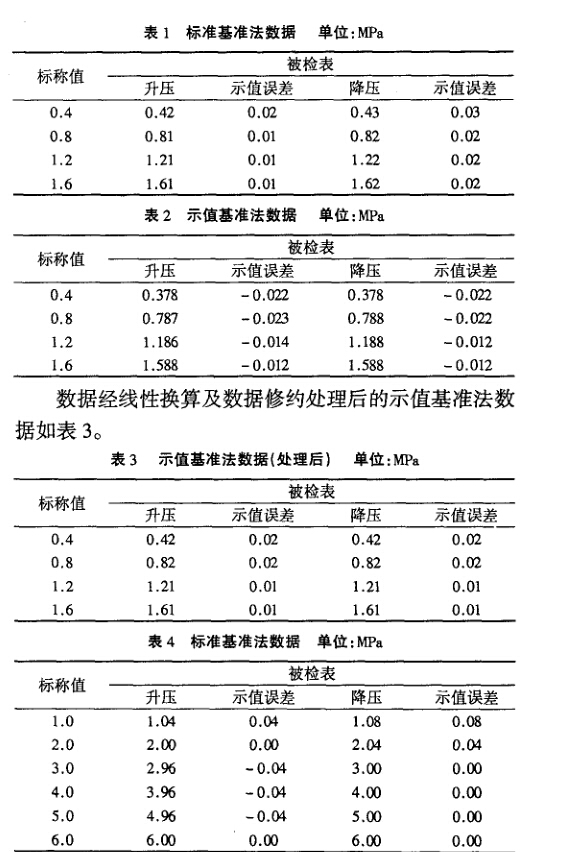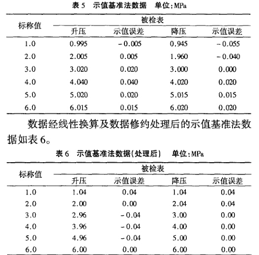 由于兩組初始數據無法做直接比較,需要對實驗數 據進行線性換算,按照P標/P被=標/P'被的關系,將示 值基準法數據轉換為標準基準法的數據,將轉換后的數 據以被檢表的估讀進行修約處理。