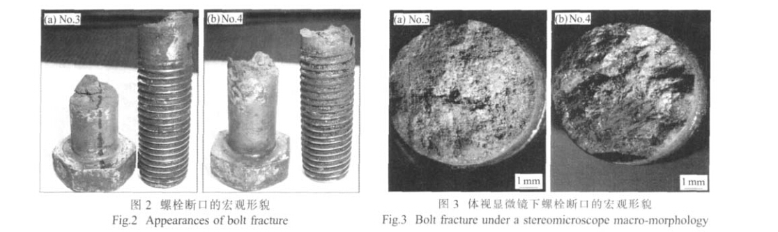 該法蘭上斷裂螺栓的圖片見圖1。在法蘭上共有四支螺栓,其中兩支斷裂,斷裂均發生在螺桿的非螺紋部分,如圖1(c)、(d)所示。