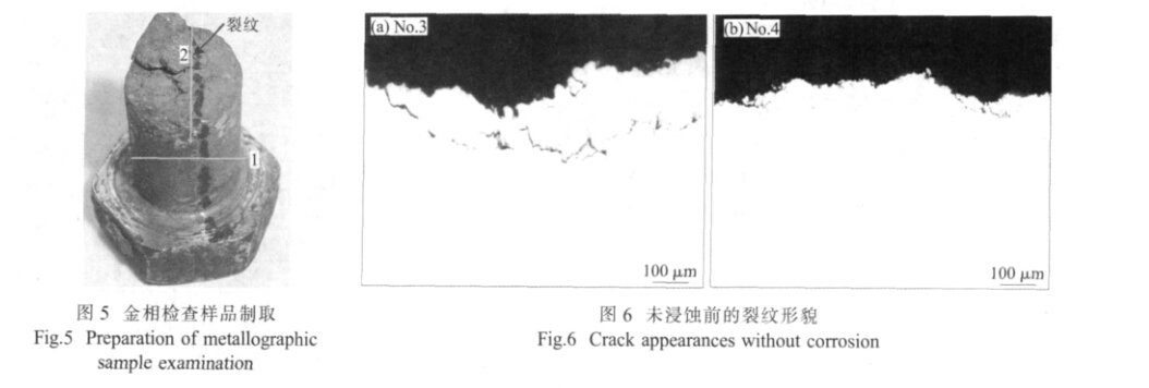 金相檢驗是斷裂分析中的重要手段。通過金相 檢驗可以查明斷裂損壞的原因,例如某些由于材質 缺陷或者環境介質等因素所導致的破壞,需要通過 金相檢驗來判別損壞的原因。同時,在對裂紋進行檢 查時,裂紋尖端的試樣往往可以提供最有價值的信 息。這是由于裂紋尖端受環境介質的影響較小,容易 判別裂紋擴展路徑的方式。因此,本文中對斷裂的 螺栓進行了金相檢查,如圖5所示,在端口部分沿 線1方向切下,沿線2將斷口表面垂直剖開,可以觀 察到裂紋末端。