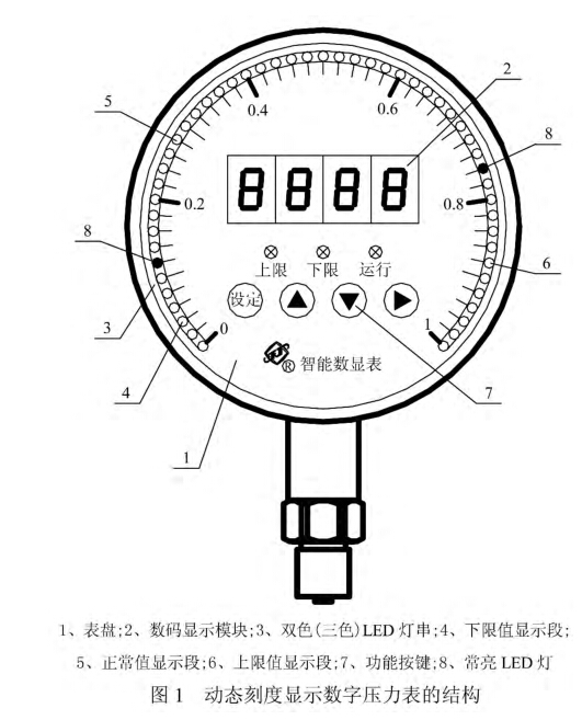 針對現有數字壓力表在顯示方面的不足,開發設計了一種能夠同時具有兩種顯示方式的 動態刻度顯示數字壓力表。它不僅能夠和一般數字壓力表一樣采用數碼管顯示壓力值,而且可以 用LED燈串模擬圓盤式機械壓力表指針指示即時壓力值,用常亮LED燈直觀地模擬顯示設定測 量信號的上限值、下限值。