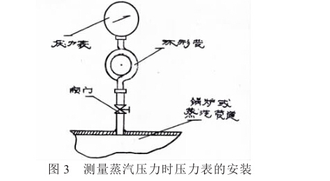 (3)測量蒸汽壓力時,壓力表下端應裝有環形管,如 圖3所示。并應由水傳遞壓力,以免高溫蒸汽沖入壓力 表內,影響測量準確性和損壞壓力表。