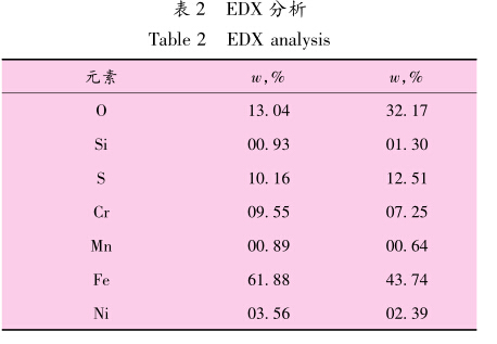 對斷口表面的微區(qū)進(jìn)行能譜分析,除金屬基體 元素外,局部氧和硫含量較高,說明介質(zhì)中含S,并 未檢測到Cl離子等其他有害元素(如表2所示)。