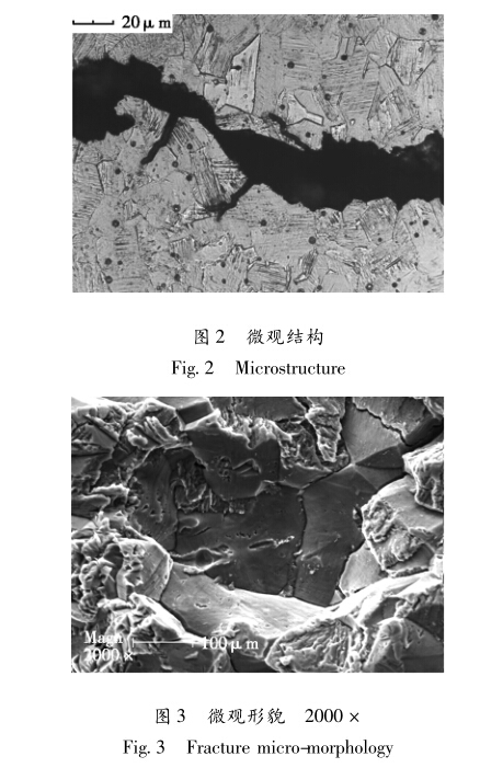 斷口的微觀形貌如圖3所示,從圖3形貌中 可以看到,沿?cái)嗝娴目v向出現(xiàn)較多的二次裂紋;觀 察到斷口表面局部有夾雜物;斷口為沿晶和準(zhǔn)解 理斷裂,局部有二次裂紋,且二次裂紋的走向全部為縱向,這些微裂紋相連,即可導(dǎo)致厚度方向的 斷裂。