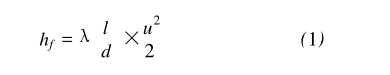 式中:hf為流體在長度為l的一段圓直管線中的流 動阻力;A為流體的摩擦系數;1為管線長度為 管線直徑;U2為流體流動速度。