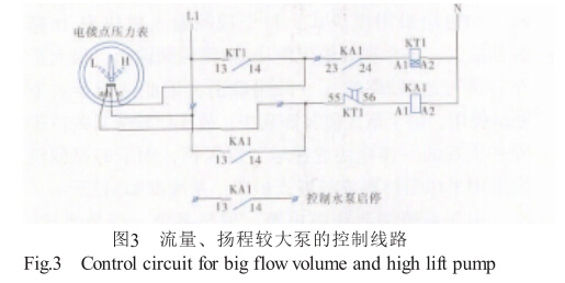為解決此問(wèn)題,可將KA2更換為時(shí)間繼電器,見(jiàn) 圖3,使b-c接點(diǎn)接通時(shí)延時(shí)Us停泵,有效消除起泵 時(shí)管網(wǎng)的壓力波動(dòng)。另外,電接點(diǎn)壓力表應(yīng)盡可能遠(yuǎn) 離水泵安裝,這樣也可以減小泵本體振動(dòng)及啟停時(shí)管 網(wǎng)壓力波動(dòng)對(duì)電接點(diǎn)壓力表接點(diǎn)通斷的影響。