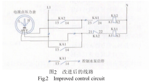 為了克服上述缺點(diǎn),可按圖2修改原理圖。在接點(diǎn) b- c間增加閉鎖接點(diǎn),一旦電接點(diǎn)壓力表指針碰上高 位接點(diǎn),KA2中間繼電器立即閉鎖,消除了接點(diǎn)b-c 的抖動(dòng)。同時(shí)為了能保證管網(wǎng)壓力到達(dá)低限時(shí)a-b接 點(diǎn)能啟泵,將KA1的常開(kāi)接點(diǎn)串入本回路,見(jiàn)圖2。 修改后的接線可以很好地消除管網(wǎng)壓力升至上限值 時(shí),接點(diǎn)b-c抖動(dòng)而引起的接觸器跳躍現(xiàn)象。此接線 己在幾個(gè)工程運(yùn)行數(shù)年,實(shí)踐證明很可靠。