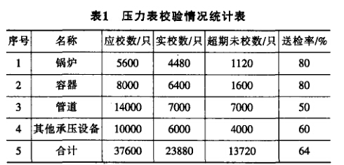 從壓力表校驗情況統計表中不難看出壓力表 的管理、使用情況不容樂觀,有近40%的壓力表沒有 送檢或超期未校,這給企業的生產運行帶來了安全 隱患。安全生產重于泰山,國家從中央到地方現在 對安全生產都極其重視。我們要主動配合,找到工 作的切人點,積極參與安全生產管理,把安全生產 管理每項工作盡可能落到實處。