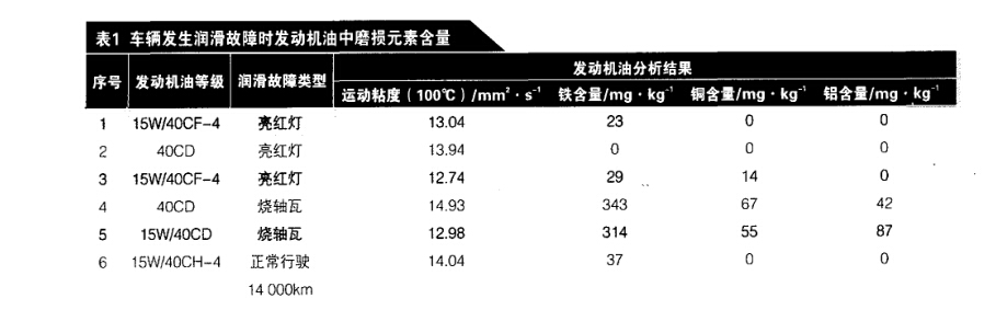 部分國內(nèi)車輛設(shè)計者未從過去依 靠粘度保證潤滑的觀念上轉(zhuǎn)變過來, 將最小發(fā)動機油壓力設(shè)計得太高,使 發(fā)動機油壓力表在仍能很好潤滑的情 況下也亮紅燈。筆者曾通過測定車輛 發(fā)生潤滑故障時發(fā)動機油中磨損元素 (Fe、Cu、Pb )含量的變化對這一情 況進行跟蹤,分析數(shù)據(jù)見表1。