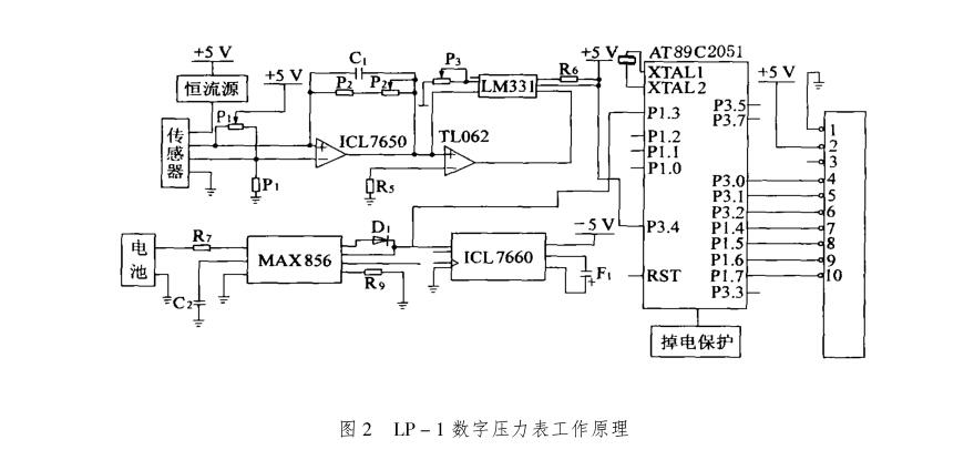 數字壓力表主要是由壓力傳感器與顯示電路所 組成,通過電纜連接。放大電路將傳感器輸出信號 放大并轉換成數字信號,經單片機處理后由液晶顯 示器顯示,工作原理如圖2所示。當被檢測對象受 壓力時,傳感器中的應變片會變形,從而引起電阻 變化,再通過對電位器Pi的調節來傳遞壓力信號。 其中必須得有個恒流源來提供它正常工作所需的電 壓。因為傳感器傳輸過來的信號是很小的,所以要 經過ICL7650放大。為了能夠更準確地得到壓力 值,該儀表增加了 TL062 二次放大,這樣采集到 的數據只是電壓信號,而單片機識別的是頻率信 號,所以電路中增加了 LM331作為V/F轉換,保 證了送到AT89C2051的信號是頻率信號,然后將 數據傳輸到顯示器。考慮到現場實時數據采集記錄 的不方便,該儀表軟件設計了存儲功能。另外在硬 件方面也增加了斷電保護電路,因為當儀表斷電的 時候,以前所儲存的一切數據都會丟失,但有了斷 電保護后儲存的數據就不會丟失了,當電池充電后 以前儲存的數據依然可以取出。