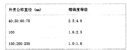 機械壓力表中的彈性敏感元件隨著壓力的變化而產(chǎn)生彈性變形。機械壓 力表采用彈簧管(波登管),膜片,膜盒及波紋管等敏感元件并按此分類所測童 的壓力一般視為相對壓力。一般相對點選為大氣壓力。彈性元件在介質(zhì)壓力 作用下產(chǎn)生的彈性變形,通過壓力表的齒輪傳動機構(gòu)放大,壓力表就會顯示出 相對于大氣壓的相對值(或髙或低)。一般壓力表的測量精確度等級和表盤直徑 的關(guān)系如下表: