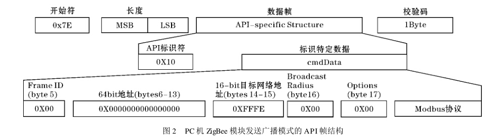 標準的Modbus是使用RS-232兼容串行接口定義了連接口的針腳、電纜、信號位、傳輸波特率、奇偶校驗。 控制器能直接或經由Modem組網。原來的標定軟件采用Modbus協議是基于數據鏈路層的通信,而ZigBee API模式是網絡層的通信。這樣就要求在Modbus的基礎上加上API的協議層,才能讓標定軟件實現ZigBee 順利通信。ZigBee的API模式幀結構框架如圖1所示,數據幀中API標識符cmdID表明cmdData中包含何種數 據。在本程序設計使用的XBee系列2模塊中當cmdID = 0X10時,表明ZigBee傳輸數據請求;cmdID = 0X90 時,表明ZigBee接受數據包。最后一位的校驗碼(數據校驗和)是用來檢驗數據的完整性。