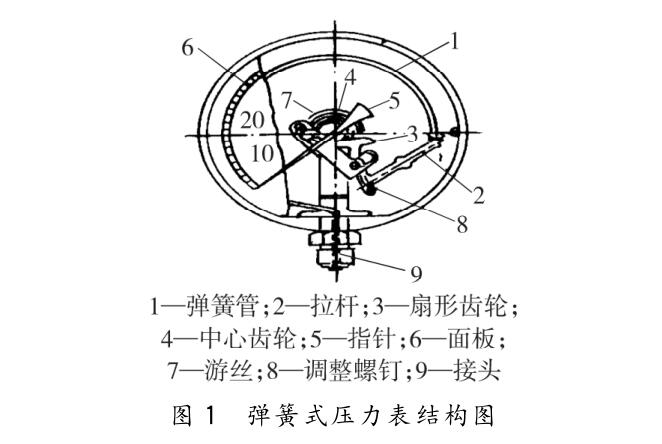 在化工企業(yè)中,最常使用的則是彈簧式壓力表, 且主要由接頭、度盤、指針、稱圈、傳動機(jī)構(gòu)等組成, 具體如圖1所示。