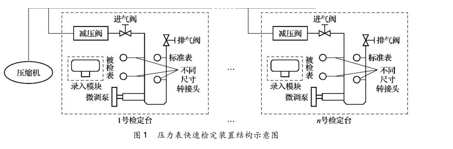 文章研究介紹一種壓力表半自動化檢定裝置,用壓縮空氣作介質,由減壓器操縱快速升降壓的檢定臺和 一種數據快速錄入軟件系統組成,檢定效率優于手動和全自動檢定系統。本系統分為硬件裝置和軟件系統兩個 部分,硬件包括電腦、打印機、空氣壓縮機、氣體減壓器、微調閥、連接管路和若干標準接口、計量標準,軟 件部分是由數據錄入、保存系統和證書生成、打印系統組成。
