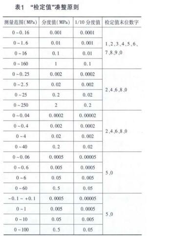 現在再以0.4級精密壓力表的20種測量范圍為 例,“檢定值”湊整原則如表1所示。