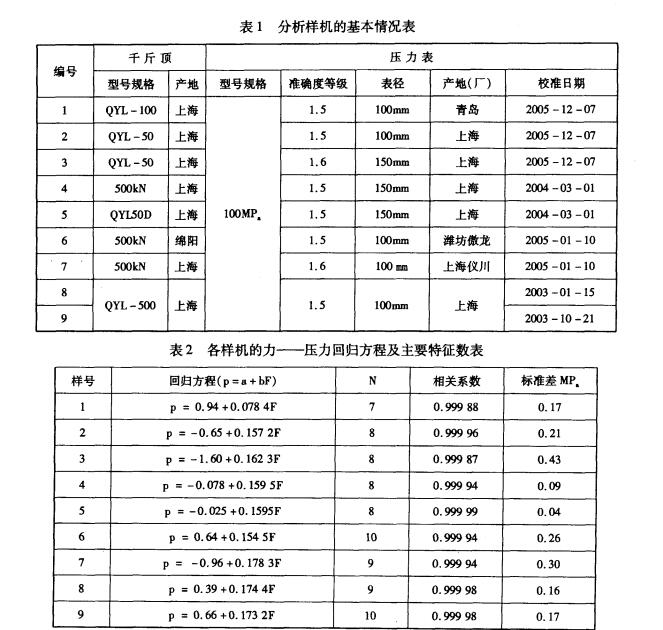 我們收集了屬于 2003 - 04 -14 ~ 2005 -12 - 27 期間校準(zhǔn)的9臺千斤頂、壓力表力值測力系統(tǒng)的計量 檢定資料,考察了它們的示值線性相對性誤差,示值 重復(fù)性相對性誤差,示值穩(wěn)定性相對誤差。(檢測系 統(tǒng)的進回程誤差也會影響地基靜載荷試驗力值的準(zhǔn) 確度,但目前的檢定單位都沒有這方面的資料)這9 臺測力系統(tǒng)都由一體式起重千斤頂和一般壓力表組 成,千斤頂?shù)膶嶋H工作壓力在77 ~88MPa間,壓力表 的分度值2MPa,基本情況如下表1所示,檢定所得 力——壓力回歸方程如表2所示。