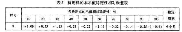 各樣本在相當(dāng)于裝置工作壓力10% ~ 100%范圍內(nèi)由式3得到的各檢定點的示值穩(wěn)定性相對誤差如表5所示。
