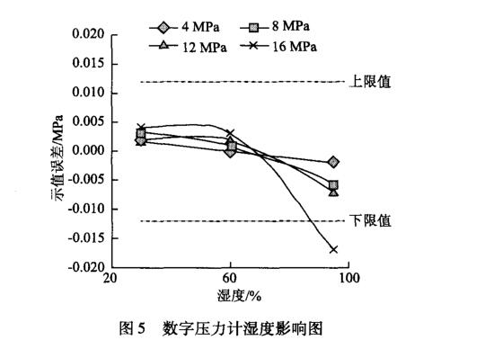 所試驗(yàn)4個(gè)60 MPa量程的數(shù)字壓力計(jì)在30% ~ 95%濕度范圍內(nèi),均滿足0.05級(jí)的要求。25 MPa量程 較60 MPa量程受濕度影響大,且濕度越大,其示值誤 差越大,所以在60%以上濕度情況下,數(shù)字壓力計(jì)的 示值受到濕度的影響較大,應(yīng)對(duì)其影響進(jìn)行試驗(yàn),以 確定能否使用。
