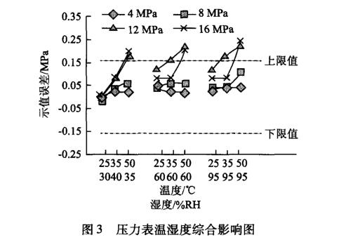某16 MPa壓力表的溫濕度綜合影響曲線圖如圖3。 圖3中,橫軸下方溫度值位于濕度值之上。