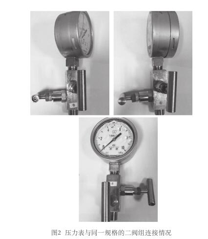 輸氣站在安裝壓力表時(shí),為保護(hù)管道焊接式接 頭,常附加二閥組或轉(zhuǎn)換接頭來連接壓力表。而壓 力表的安裝程度并不完全一致,無論是旋入到接頭 的圈數(shù)還是表盤的最終朝向都有所差異。將同一塊 壓力表分別與二閥組、轉(zhuǎn)換接頭進(jìn)行手動(dòng)連接,擰 緊后的效果如圖1所示。