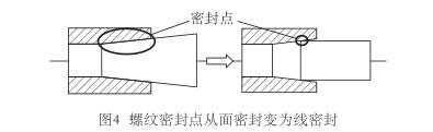 輸氣站壓力表安裝的密封性對生產(chǎn)安全至關(guān) 重要,而螺紋之間的配合程度對密封效果有較大影 響。同類螺紋進(jìn)行連接,配合度較高,有利于密封。 不同類的螺紋連接,配合程度是有差異的,而且由 于牙型角不同,旋緊時(shí)會將螺紋齒擠壓變形,使得 原本的面密封變成線密封,如圖4所示。