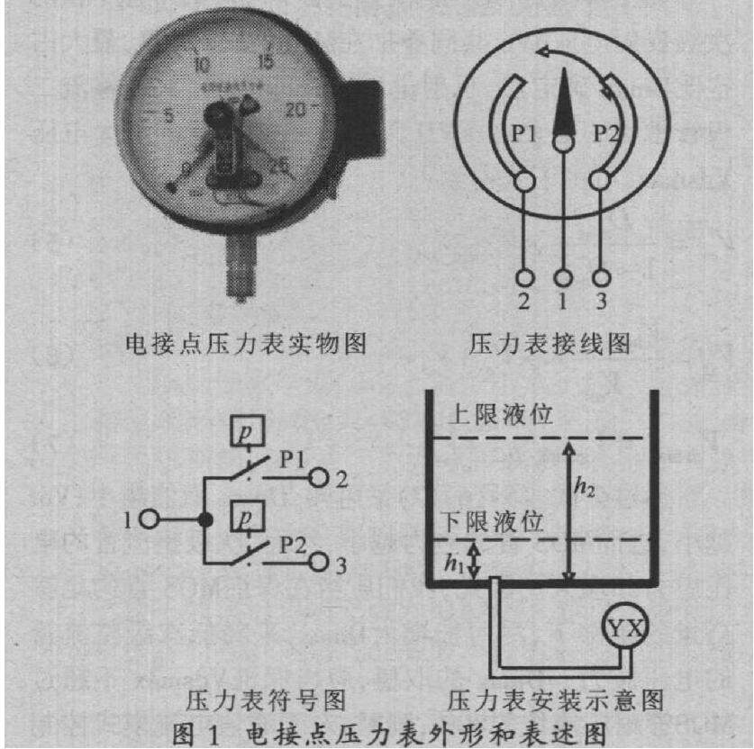 電接點壓力表通過管道與被控制的液體連通,液位的變化轉變為壓力的變化;而壓力的變化,轉變為 壓力表內開關觸點的變化,表征為開關的閉合或打開,最終驅動或停止電動機-水泵機組的運行狀態,達到 控制液位的目的。常用電接點壓力表的結構等如圖1所示。