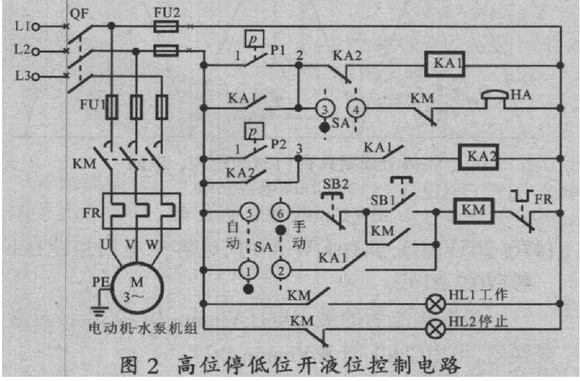 閉合三相電源開關QF,電路接通電源。左旋轉換開關SA至“自動’’位置,觸點⑤一⑥斷開,①一②、 ③一④接通。若液位處在圖1中hi和h2之間任意位置,開關P1P2調處于關斷位置,控制電路不工作, 停機指示燈HL2亮起。