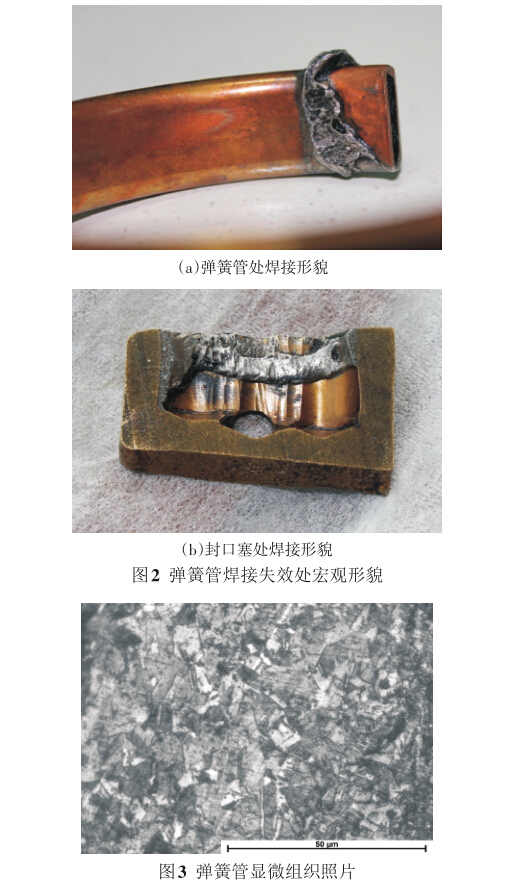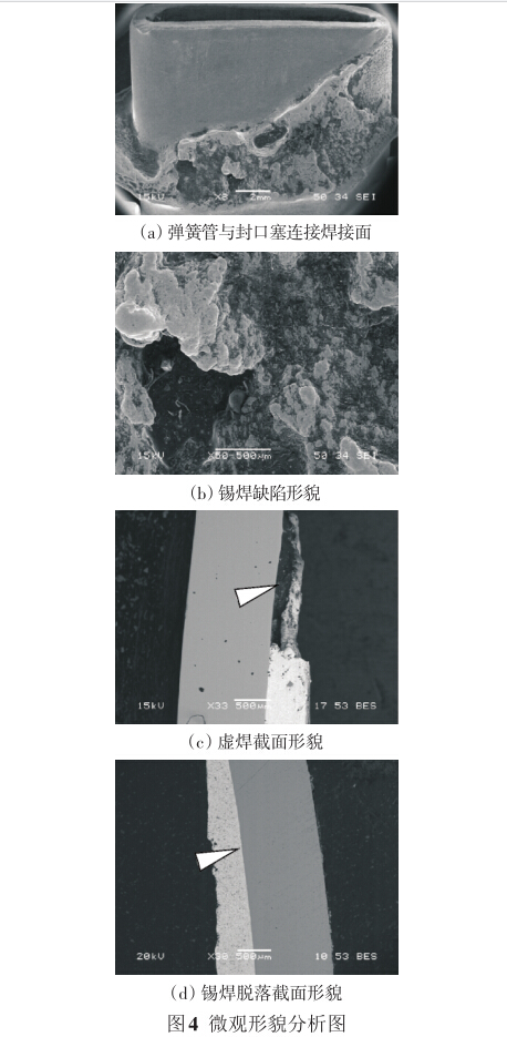 對焊接處進行微區能譜分析,如圖5所示。其 中彈簧管為純銅制造,焊料主要成分為Pb和Sn,有 微量的Al、Co雜質元素。雜質元素明顯會影響焊料 的潤濕性和流動性,加之封口塞的幾何外形容易有 氣隙和裂紋,使焊接點的強度下降。